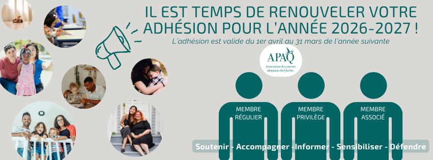 BIENVENUE!L'Association des parents adoptants du Québec favorise l’entraide, le partage et le soutien mutuel entre parents adoptants, familles d'accueil banque mixte et postulant·es à l'adoption. |