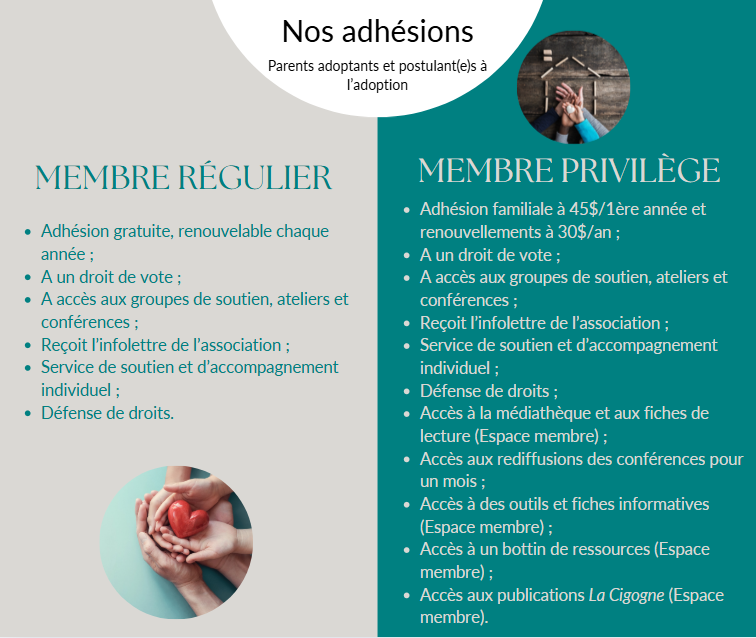 Membre régulier (gratuit!): ce membre est un(e) postulant(e) à l'adoption ou un parent adoptant. Il a droit de vote en assemblée générale, a accès à nos groupes de soutien ainsi qu'à nos conférences et ateliers. En adhérant, vous êtes recevrez également nos infolettres saisonnières.